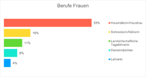 - 57 Prozent gaben Hausfrau oder Haushälterin an, gefolgt von Näherinnen, Tagelöhnerinnen in der Landwirtschaft und Dienstmädchen.