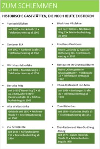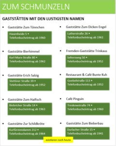 • Die Recherche in alten Telefonbüchern kann Erstaunliches aufdecken, wie Gaststätten mit amüsanten Namen, von denen einige noch existieren.