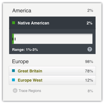 Diese Regionen sehen Sie, wenn Sie zuerst auf die Seite kommen. Um als Hauptregion in Betracht zu kommen, muss eine Region ausreichend Hinweise besitzen, dass Sie diese Region tatsächlich in Ihrer genetische Ethnie haben. Regionen, bei denen der Bereich nicht unter 1 % liegt, fallen in diese Kategorie. Betrachten wir das folgende Beispiel eines Kunden, dem prognostiziert wird, dass er 2 % genetische Ethnie eines amerikanischen Ureinwohners hat, mit einem Prozentbereich von 1 % bis 3 %. Diese Region wird in der Kategorie Hauptregionen angezeigt.
